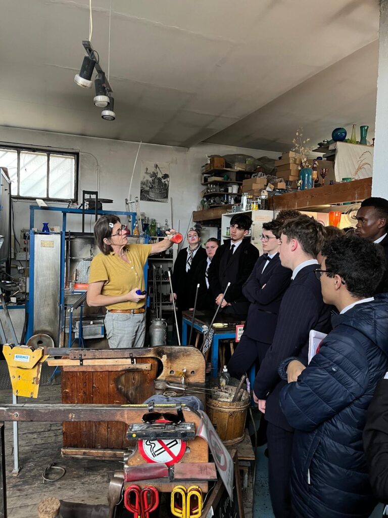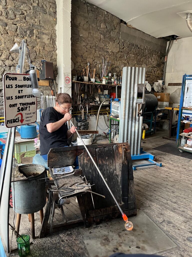 L’après-midi, le groupe s’est rendu à l’Atelier du Verre pour assister à la fabrication artisanale des verres et carafes créés spécifiquement pour les tables d’Hugo Roellinger. Moment fort : Maxime a eu l’opportunité de souffler lui-même une boule de Noël.