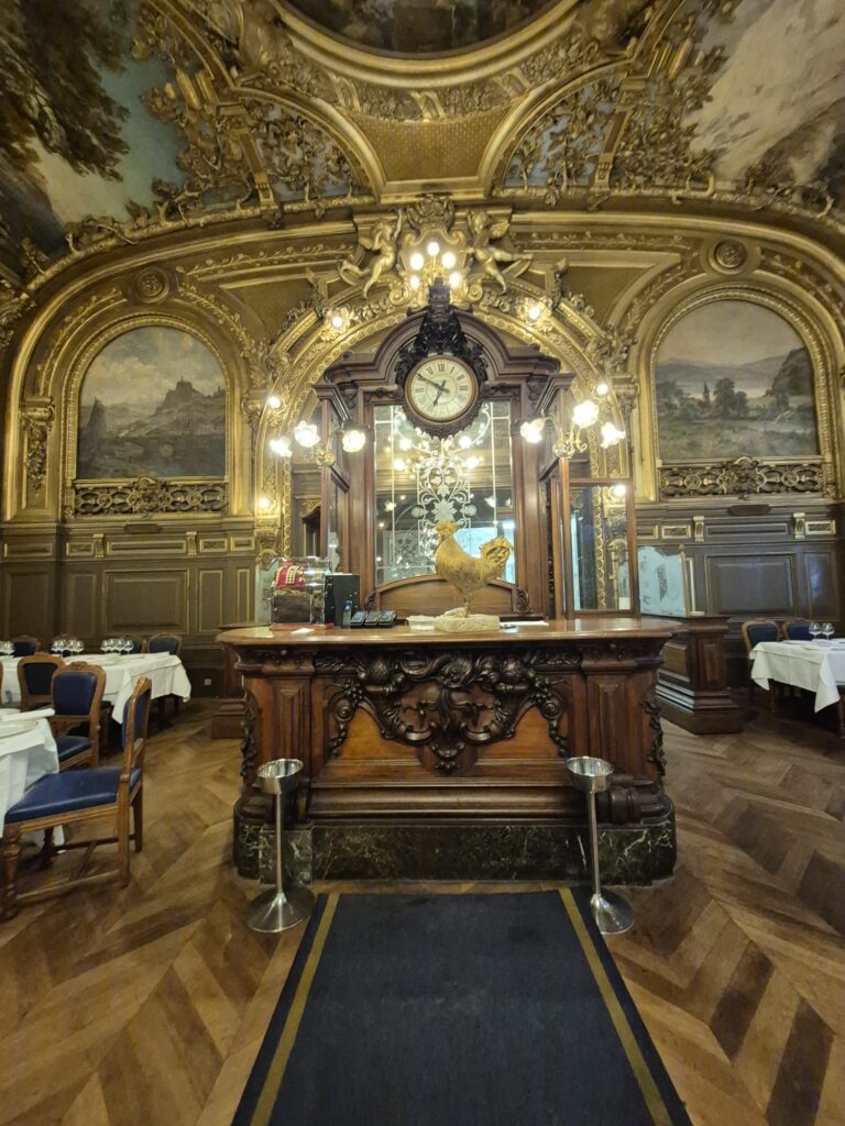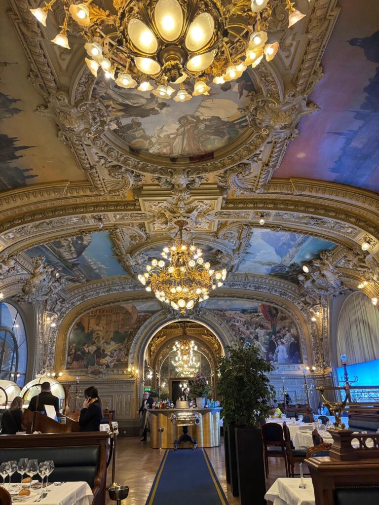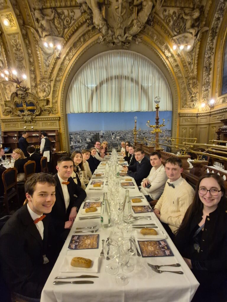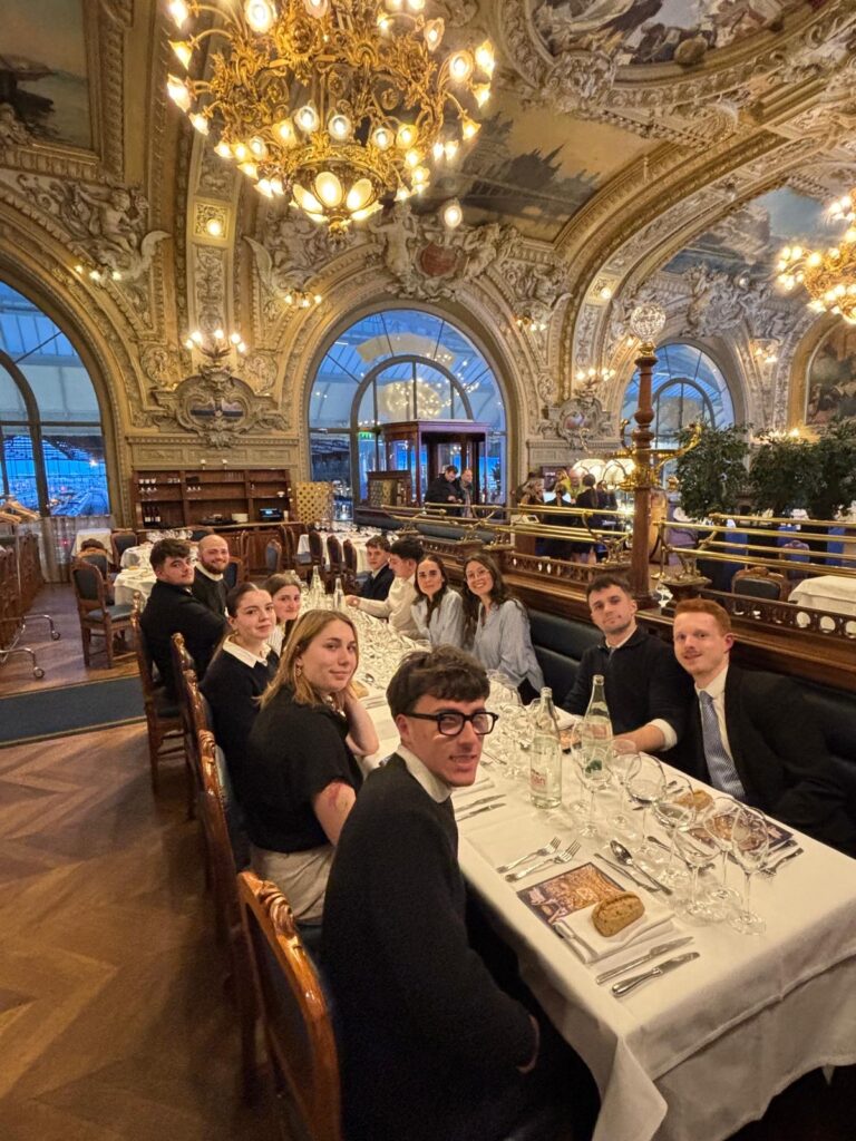 Nos étudiants ont ensuite déjeuner au Train Bleu, restaurant classé monument historique situé en Gare de Lyon, pour une expérience de restauration gastronomique : mets fins, vins élaborés et service d’exception.