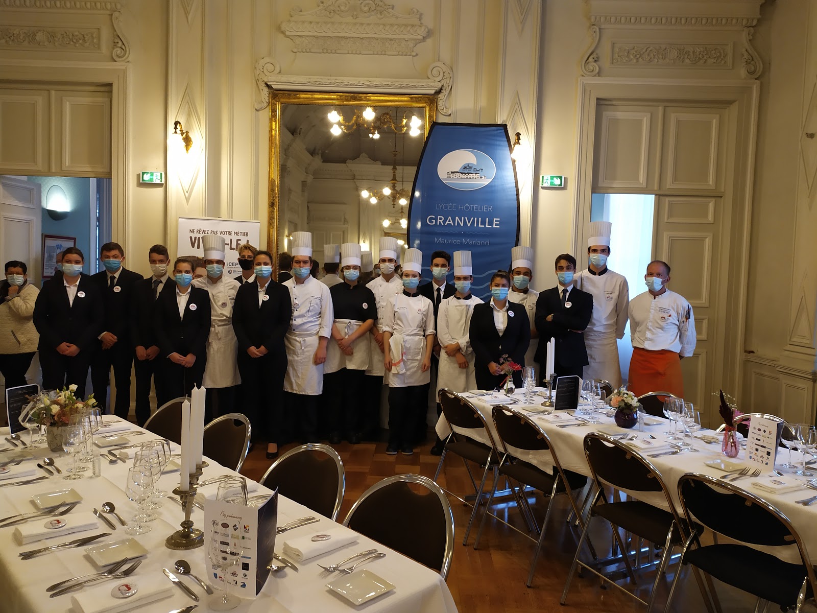 Le 14 octobre dernier, la classe de Terminale Bac Pro C du lycée hôtelier de GRANVILLE a participé à un dîner caritatif au profit du personnel soignant confronté à la crise sanitaire du Covid-19. Ce projet EPICURE, à l’initiative du chef Sébastien GODEFROY (restaurant OBIONE à Avranches), a vu la participation de Cyrille BERLAND du Café Marcel’s à Cherbourg et de Frédéric MENTEC, formateur de cuisine à l’ICEP-CFA de Caen.